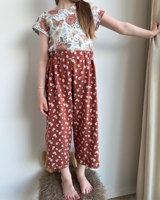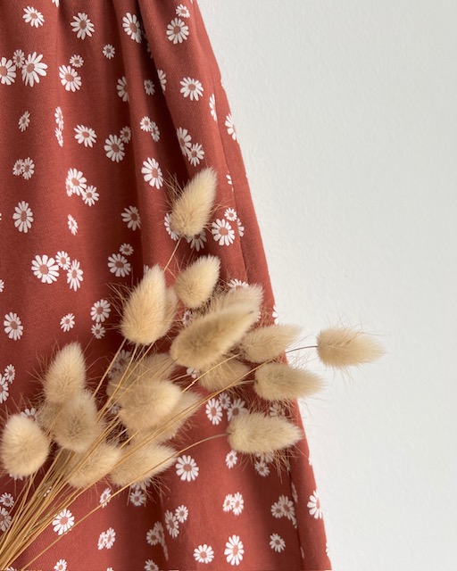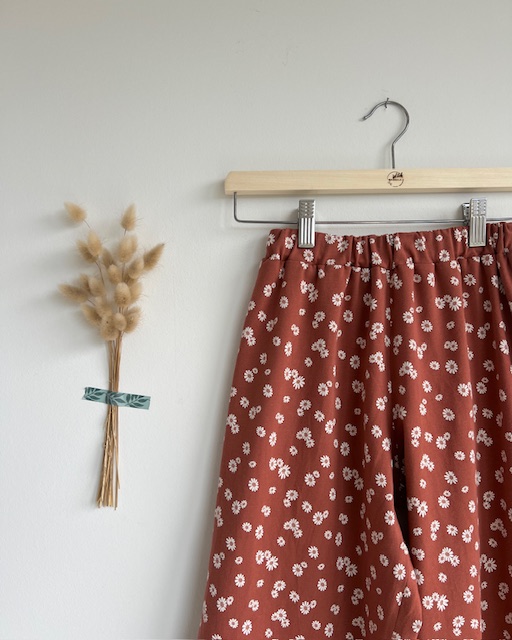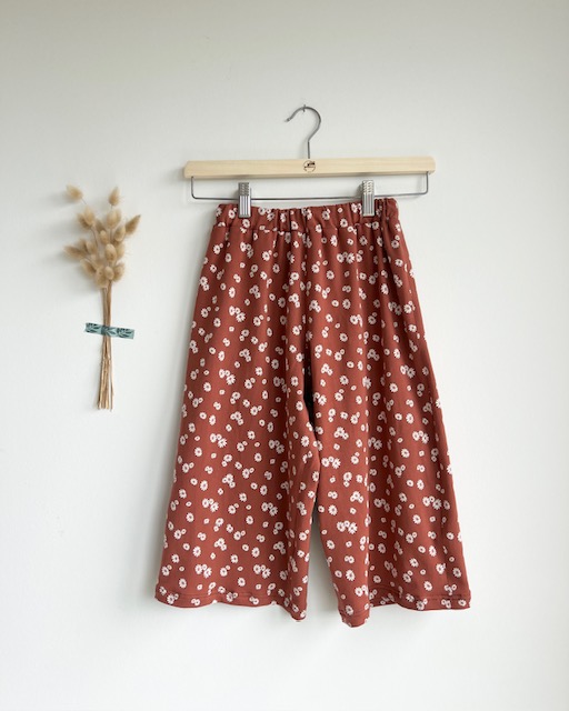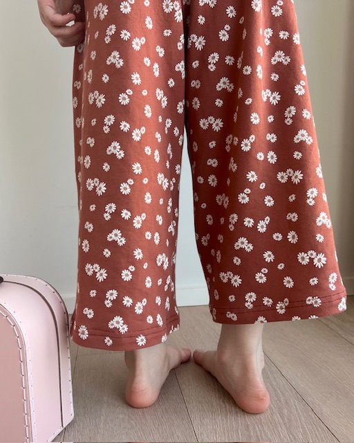 Diese Hose für Mädchen ist aus einem terracottafarbenen Baumwolljersey mit kleinen, weissen Gänseblümchen gefertigt.